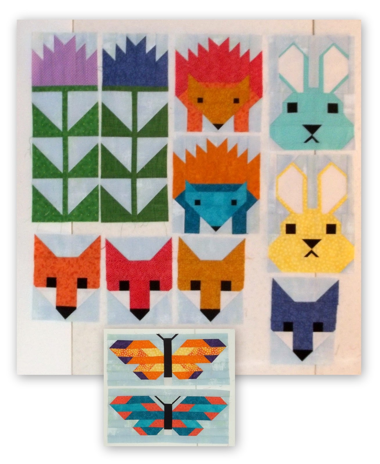 I had planned to use the scraps from the Fancy Forest quilt to make crazy improv blocks but though that is easy, it is not fast. I looked around for something I could put together fast and found these wonky blocks in my "Parts Department" box. I have a bunch of colorful small blocks that I made when the Basement Divas group was planning on making Collaborative Quilts in the style of Freddy Moran and Gwen Marston. We did make one quilt but then the group took another direction, I had forgotten about these blocks and it was really by chance I opened that box. There were 8 blocks and I made the purple block using fabric from the Fancy Forest owl block. I used left over fabric from the FF backing for the border and the purple for the binding.
